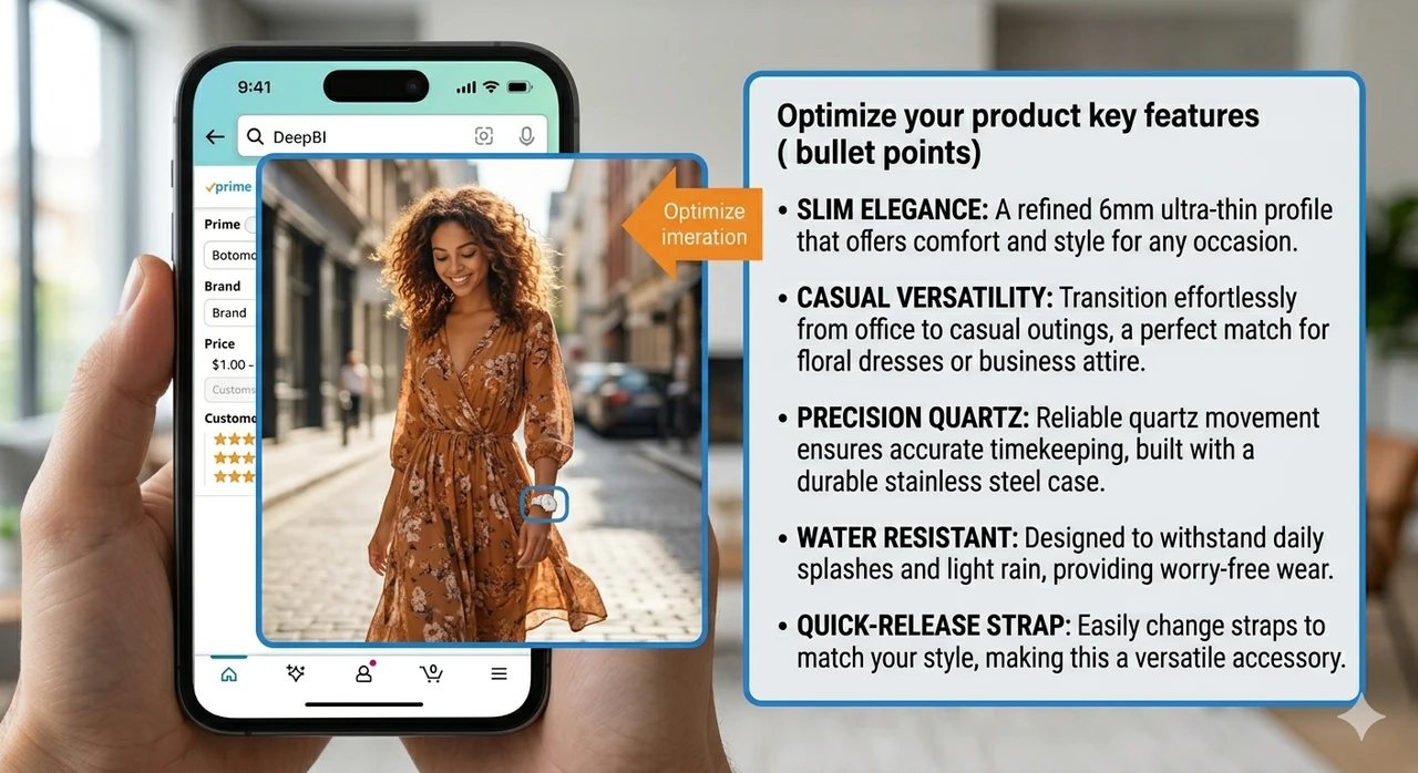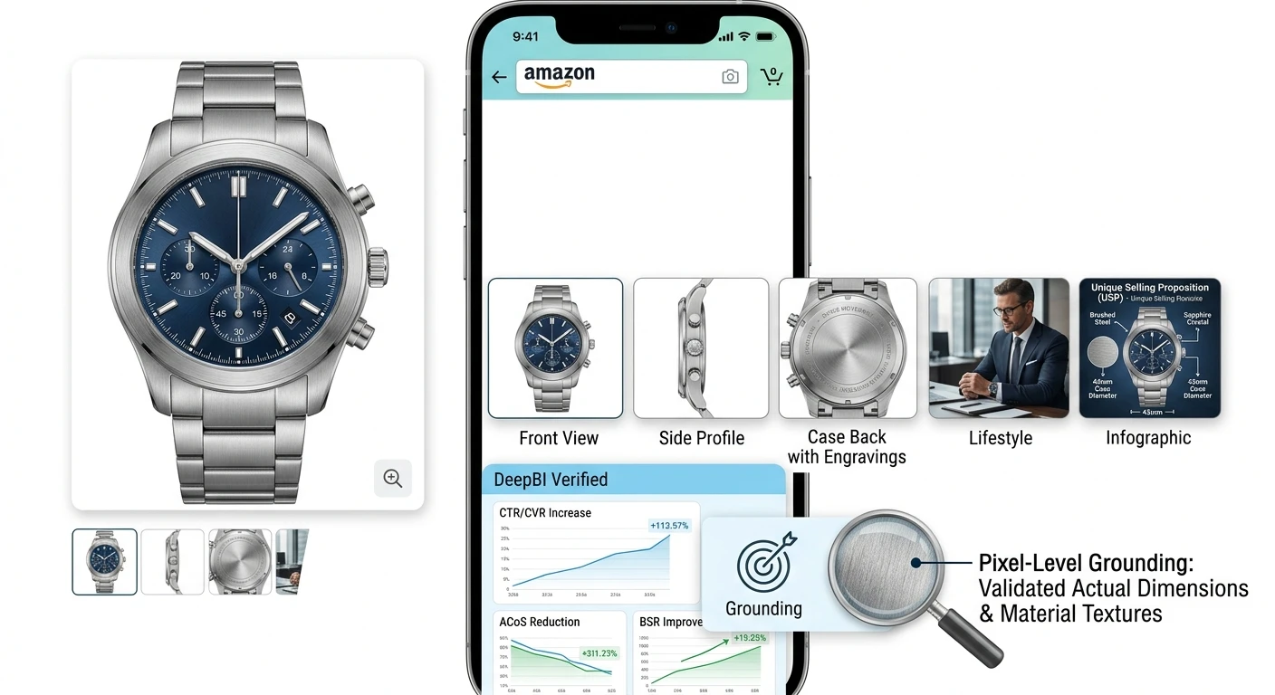 Beyond the main image, a comprehensive visual strategy requires an engineered path that includes multiple perspectives—front, side, back, and close-ups—to eliminate buyer uncertainty. DeepBI facilitates this through a quantitative audit of a listing’s visual performance, scoring images against top-performing competitors. By utilizing "product DNA" mapping and pixel-level reasoning, the system ensures that any AI-enhanced visuals remain strictly grounded in the product's actual physical parameters, such as dimensions and material textures, preventing the "hallucination" of non-existent features that could lead to negative reviews and high return rates.