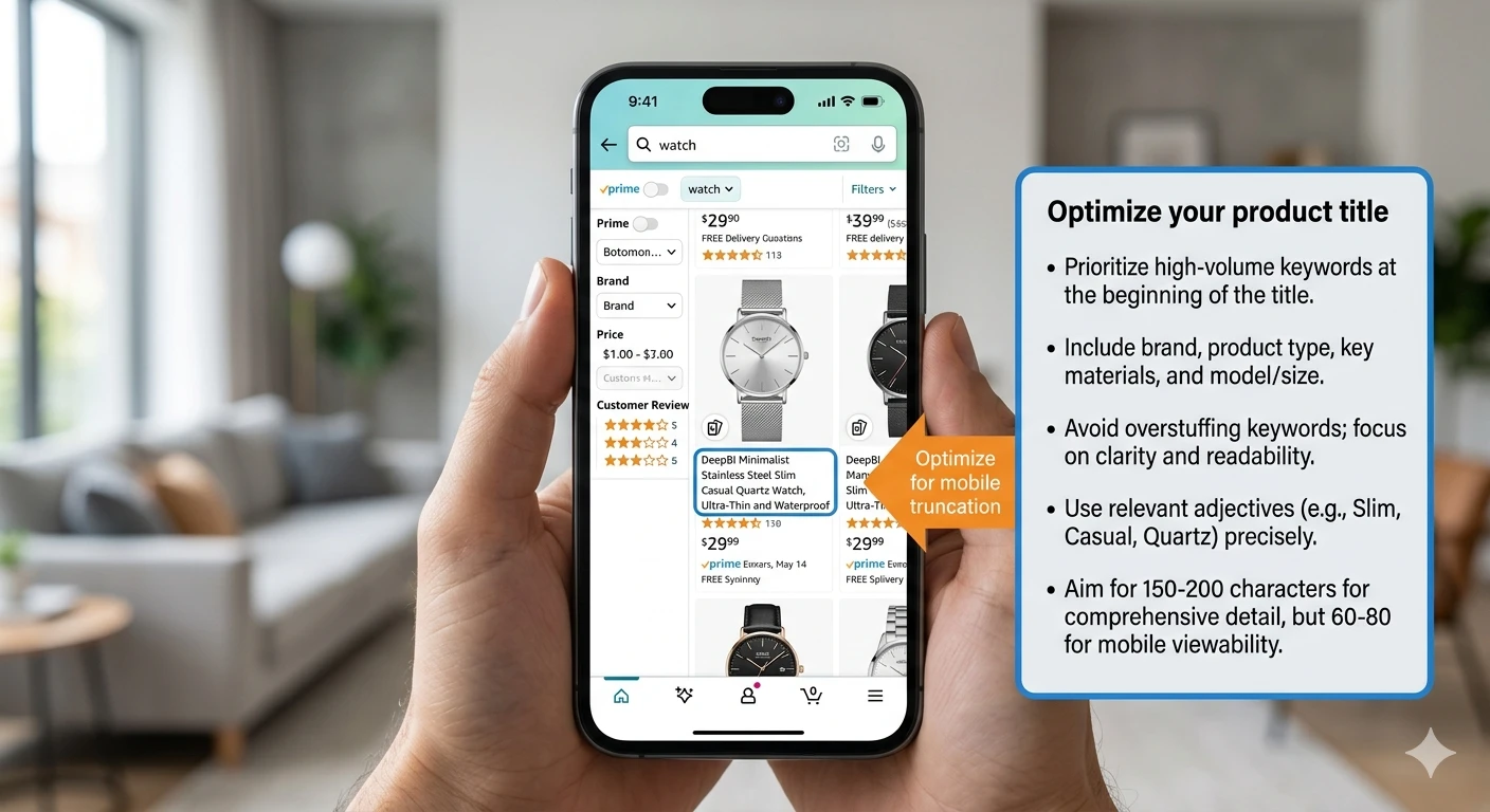 To achieve systematic optimization, titles should generally remain under 150 characters. Each word’s first letter must be capitalized, while promotional phrases should be strictly avoided to maintain professional credibility and prevent listing suppression. The structure must be logical and data-backed, typically following a sequence of Brand Name, Product Type, Key Features, and essential specifications such as size, quantity, or color.
